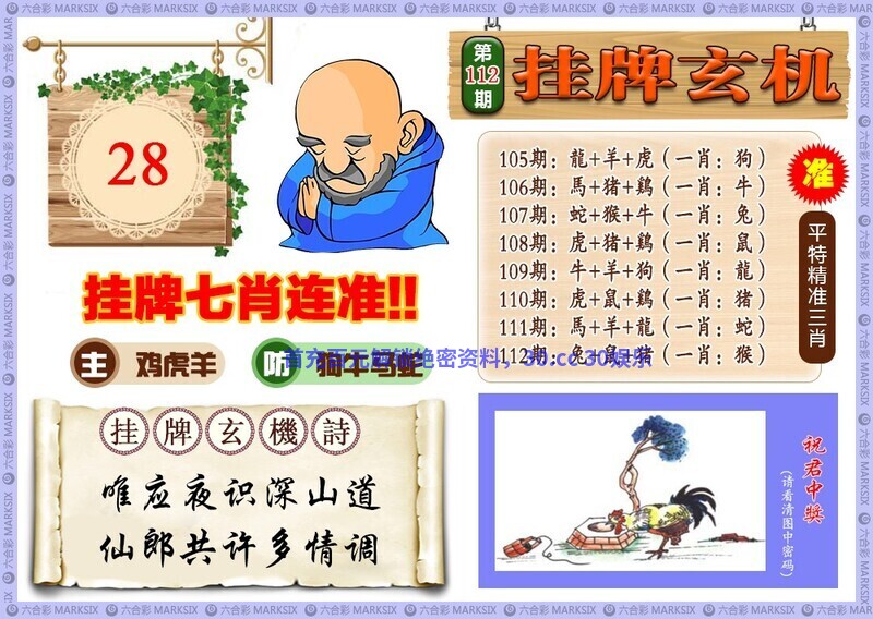 116期港彩生活关门联:鸡前马后来一数,猴儿三心到娘家。解 [来] [38726]